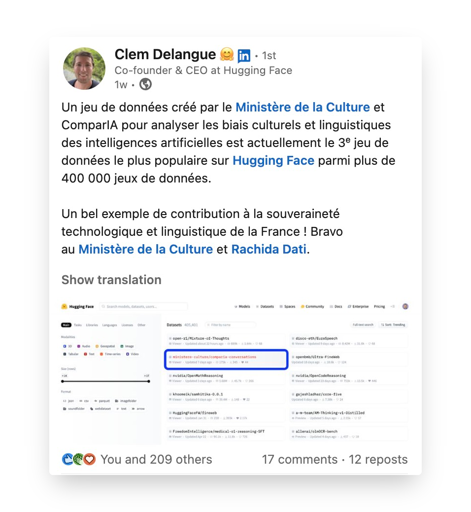 130 000 préférences sur compar:IA 🎉 | | compar:IA vient de franchir un cap : plus de 300 000 questions posées et plus de 130 000 préférences d’utilisateurs ont été recueillies sur la plateforme. Merci! Ces données, issues de conversations majoritairement en français (90%) avec différents modèles d’IA, sont désormais disponibles en open source sur Data Gouv et Hugging Face. | | Trois jeux de données sont publiés: - Les conversations anonymisées